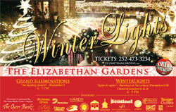 Don’t miss WinterLights at Elizabethan Gardens from 6-9 p.m. on December 6-10, 2011. Come experience Holiday lights and music transforming The Elizabethan Gardens into an illuminated winter wonderland complete with peacocks, butterflies, deer and other garden creatures created with flowers, seeds, natural elements, as well as traditional holiday decorations. Stroll through The Gardens and enjoy the spirit of the season. WinterLights is 18 nights of lights and floral displays at The Gardens! Tickets for Friends and Non-members: $9 for Adults; $7 for youth (ages 6-17); $4 for children (5 and under).